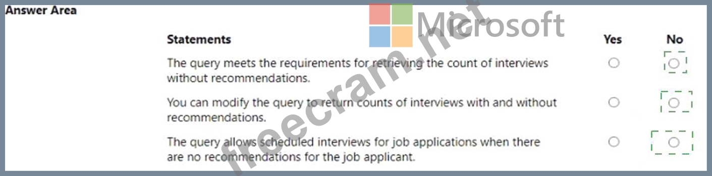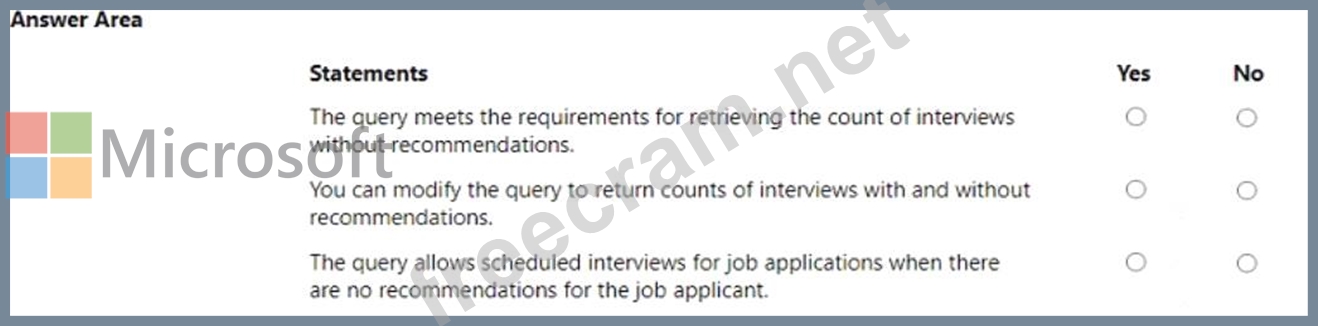You create the following Fetch XML query to determine the number of interviews where there are no recommendations for an applicant.