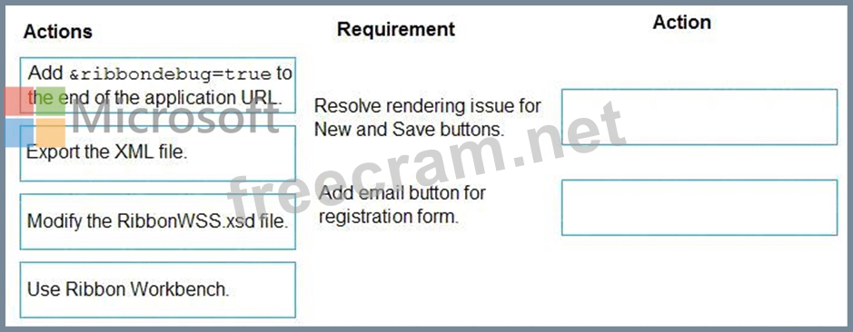 https://yourorgname.crm.dynamics.com/main.aspx?appid=9ab590fc-d25e-ea11-a81d-000d3ac2b3e6&ribbondeb Box 2: Use the Ribbon Workbench Adding Buttons to Ribbons