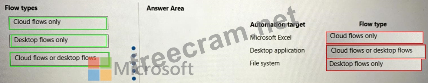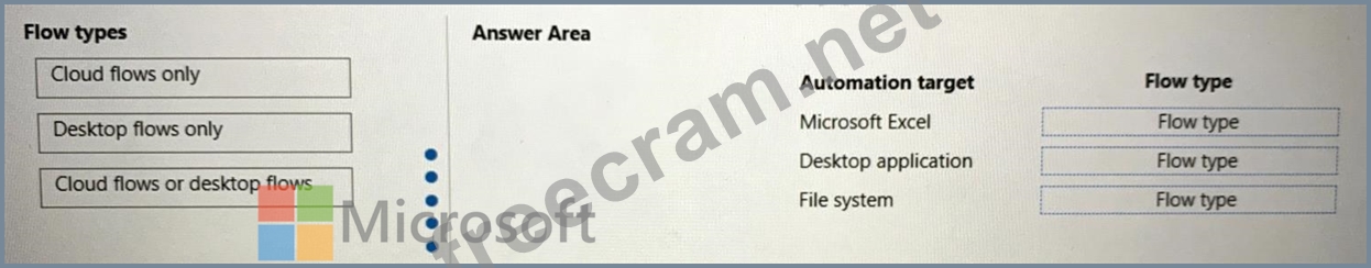 Which flow types should you use? To answer, drag the appropriate flow types to the correct automation targets. Each flow type may be used once, more than once, or not at all. You may need to drag the split bar between panes or scroll to view content.