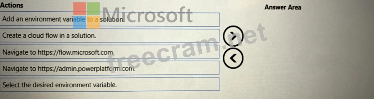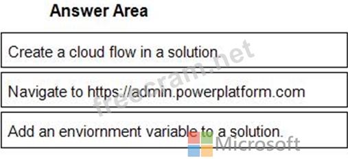 You are developing automation solutions for a company. You need to use an environment variable in a cloud flow. Which three actions should you perform in sequence? To answer, move the appropriate actions from the list of actions to the order.