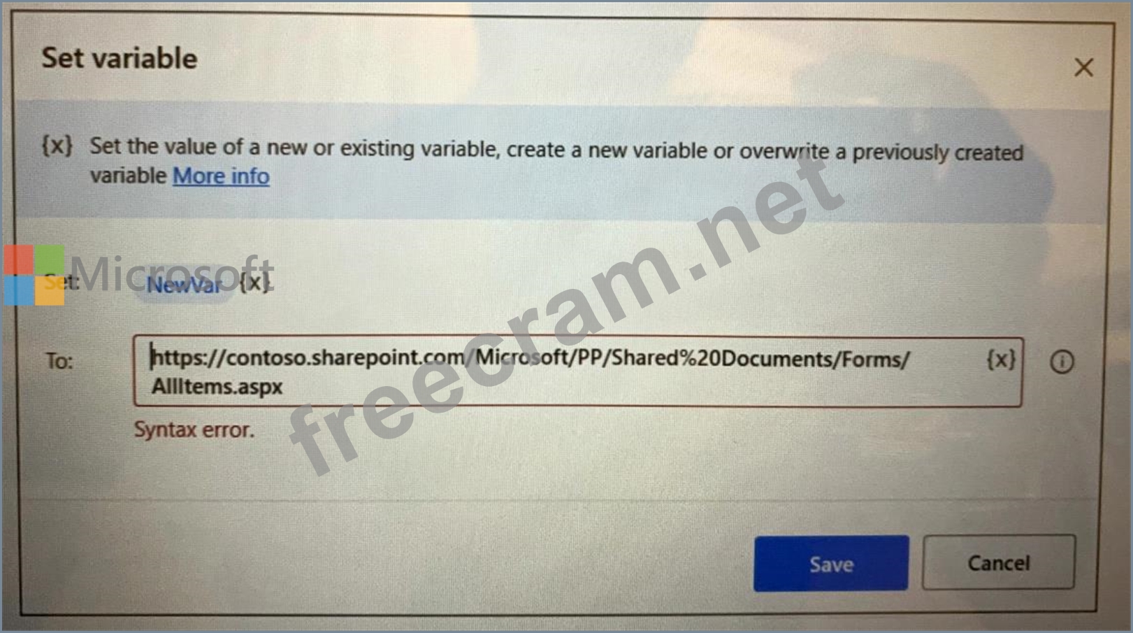 You create a variable named NewVar as shown in the configuration screen below. You attempt to set the value of NewVar to the following URL: The Set variable page alerts you that there is a syntax error. You need to resolve the issue. What should you do?
