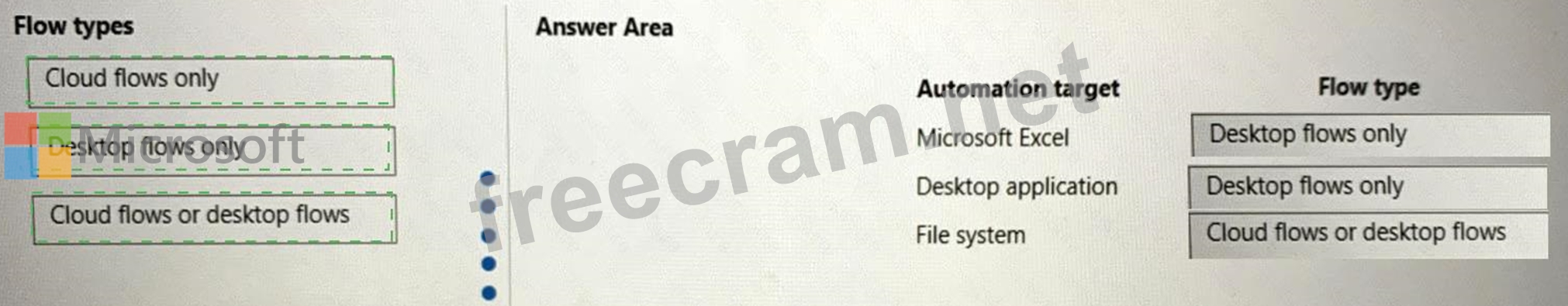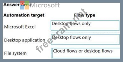 Which flow types should you use? To answer, drag the appropriate flow types to the correct automation targets. Each flow type may be used once, more than once, or not at all. You may need to drag the split bar between panes or scroll to view content.