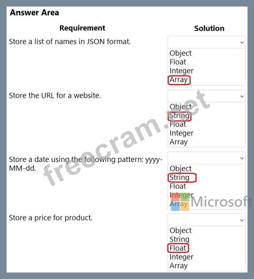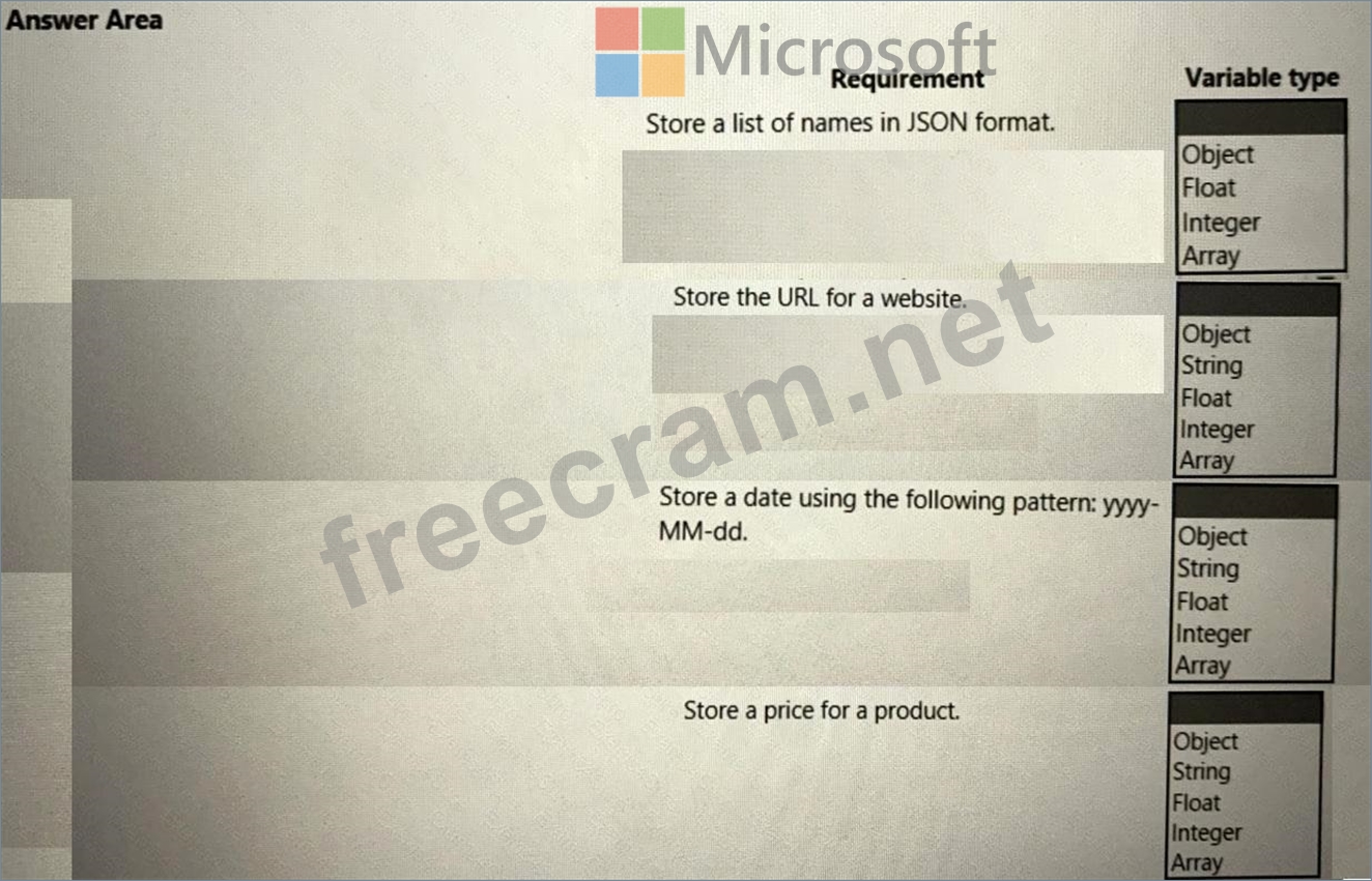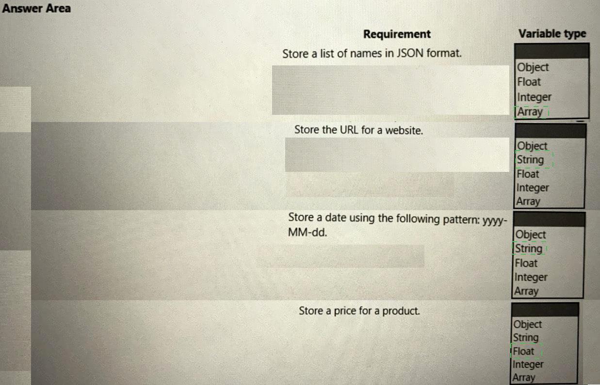 Which types of variables should you use for each type of data? To answer, select the appropriate options in the answer area.