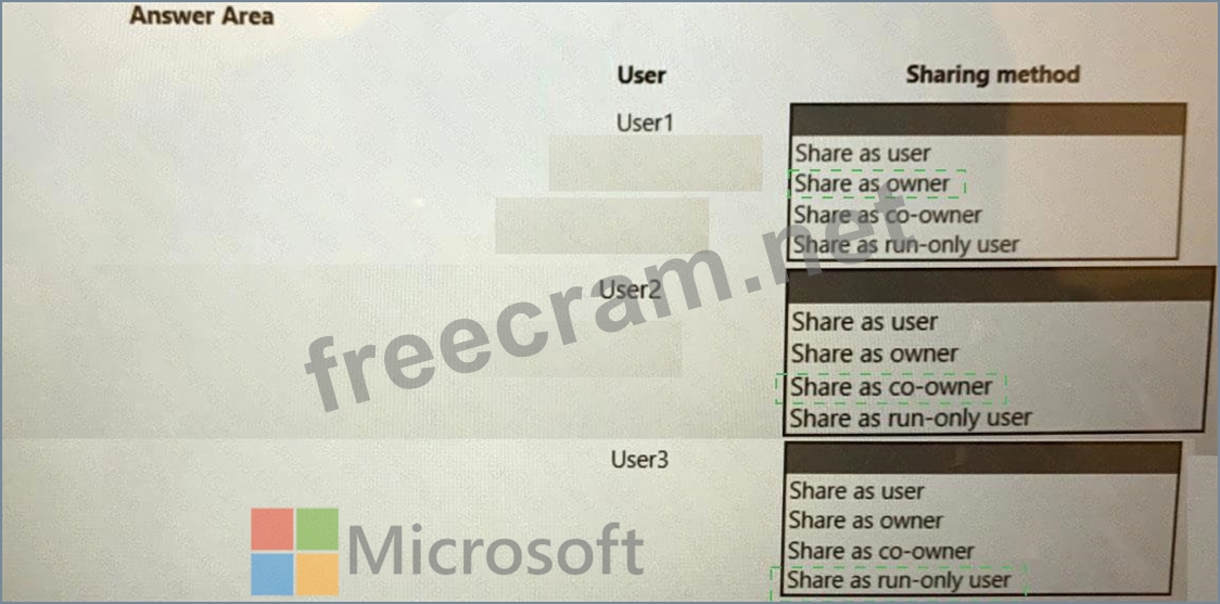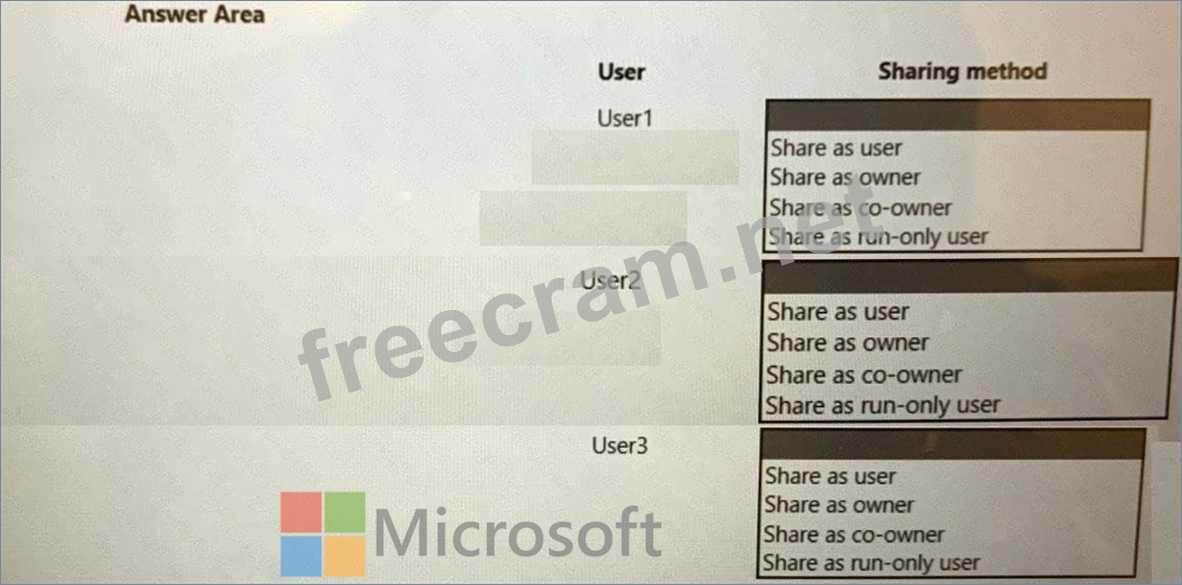 According to the scenario, you want to share the MaintenanceScheduler cloud flow with three users who have different roles and permissions. To do this, you can use the following sharing methods: