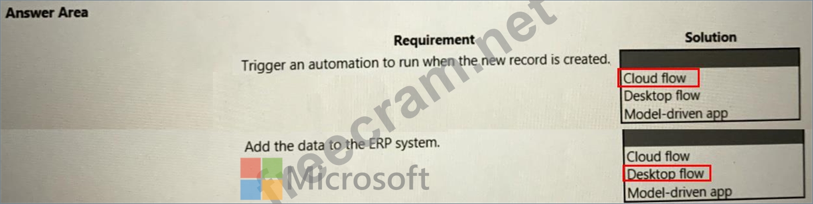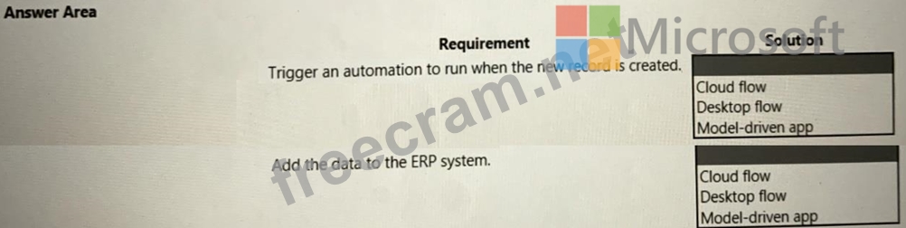 You are creating an automation for a company. When a new record is created in a Microsoft Dataverse table, the automation must add the same data to an enterprise resource planning (ERP) system. The ERP system does not have an API.