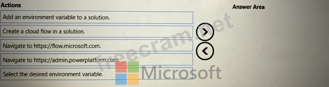 You are developing automation solutions for a company. You need to use an environment variable in a cloud flow. Which three actions should you perform in sequence? To answer, move the appropriate actions from the list of actions to the order.