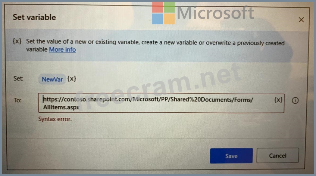 The Set variable page alerts you that there is a syntax error. You need to resolve the issue. What should you do?