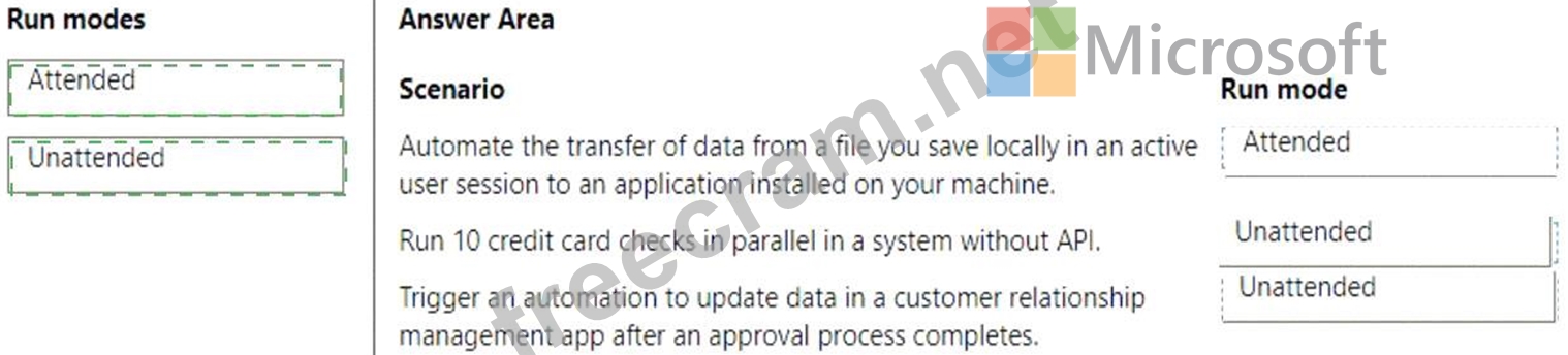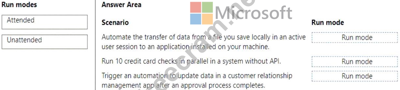 Which run modes should you use? To answer, drag the appropriate run modes to the correct scenarios. Each run mode may be used once, more than once, or not at all. You may need to drag the split bar between panes or scroll to view content.