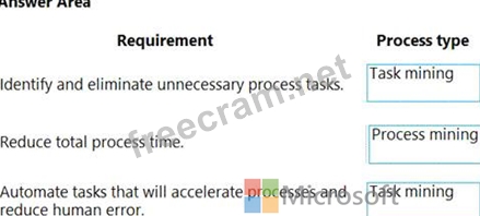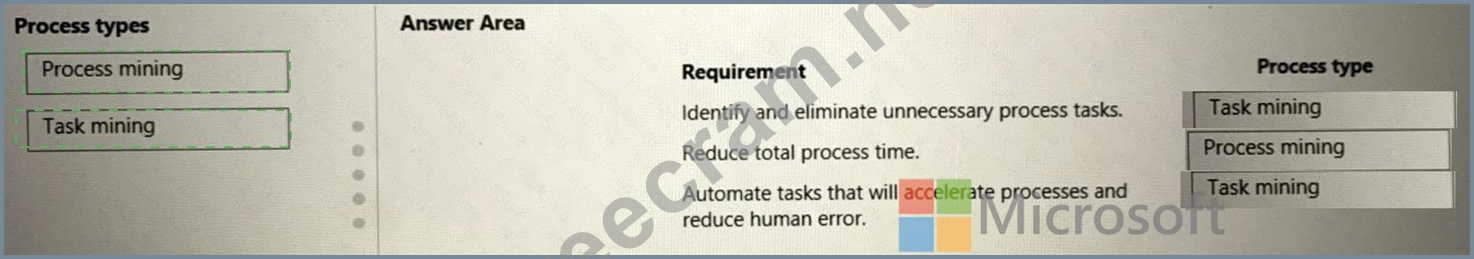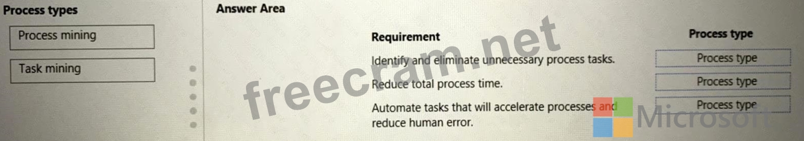 Which process types should you use? To answer, drag the appropriate process types to the correct requirements. Each process type may be used once, more than once, or not at all. You may need to drag the split bar between panes or scroll to view content.