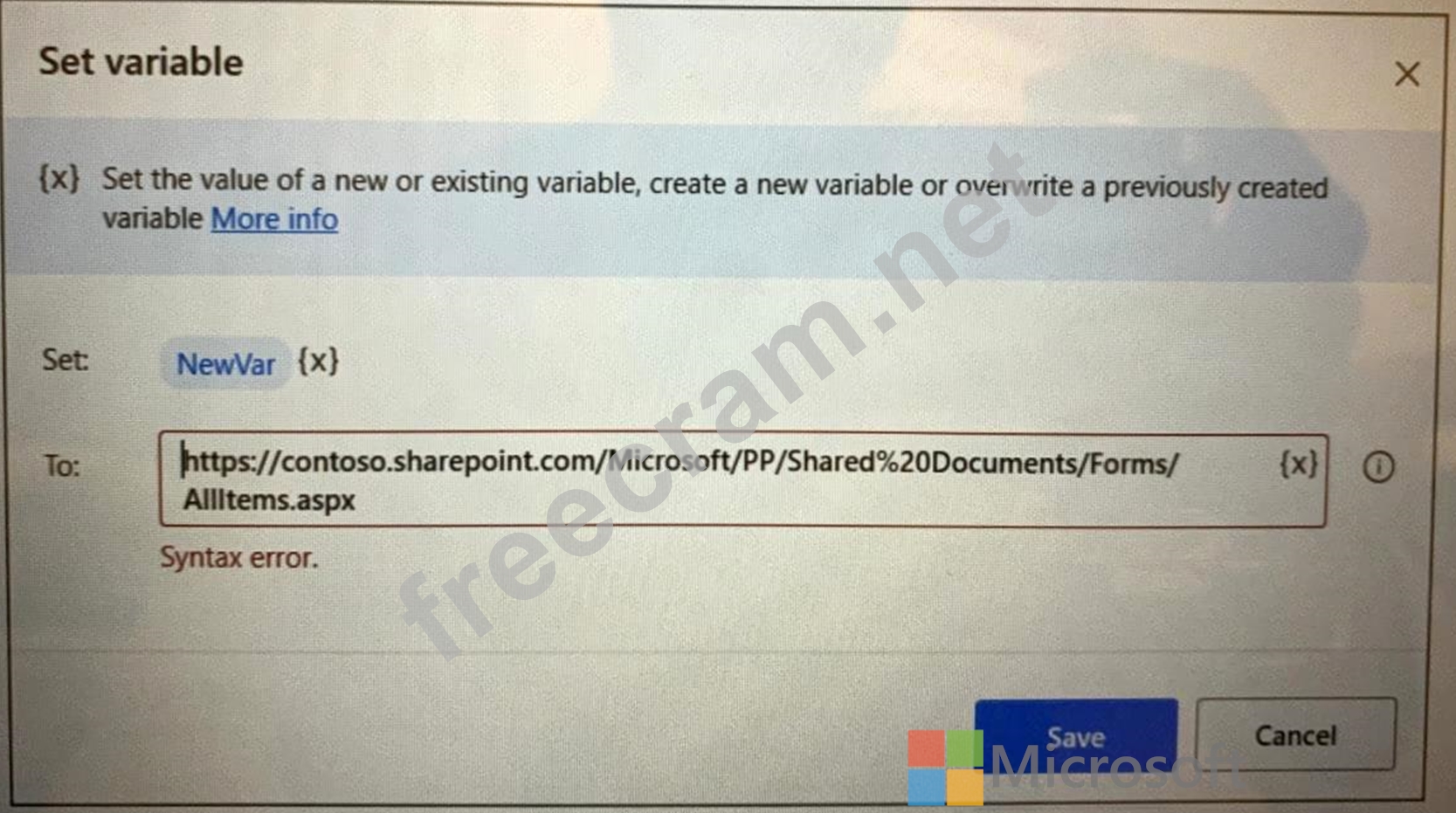 The Set variable page alerts you that there is a syntax error. You need to resolve the issue. What should you do?