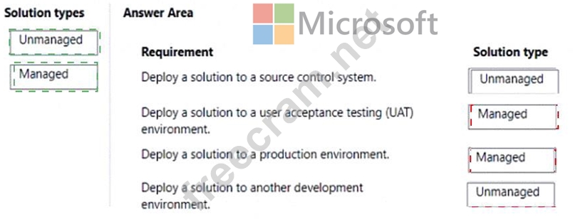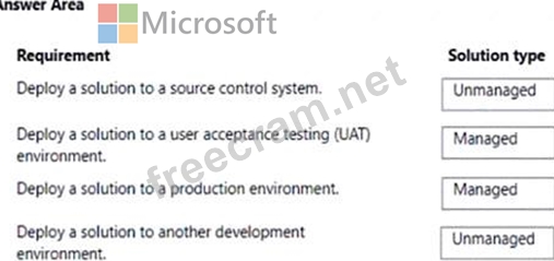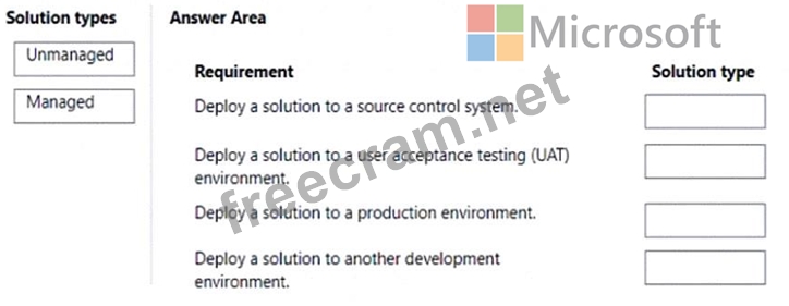 Which type of solutions should you create? To answer, drag the appropriate solution types to the correct requirements. Each solution type may be used once, more the once, or not at all. You may need to drag the split bar between panes or scroll to view content.