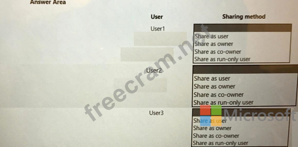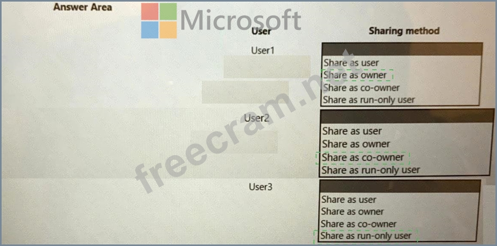 According to the scenario, you want to share the MaintenanceScheduler cloud flow with three users who have different roles and permissions. To do this, you can use the following sharing methods:
