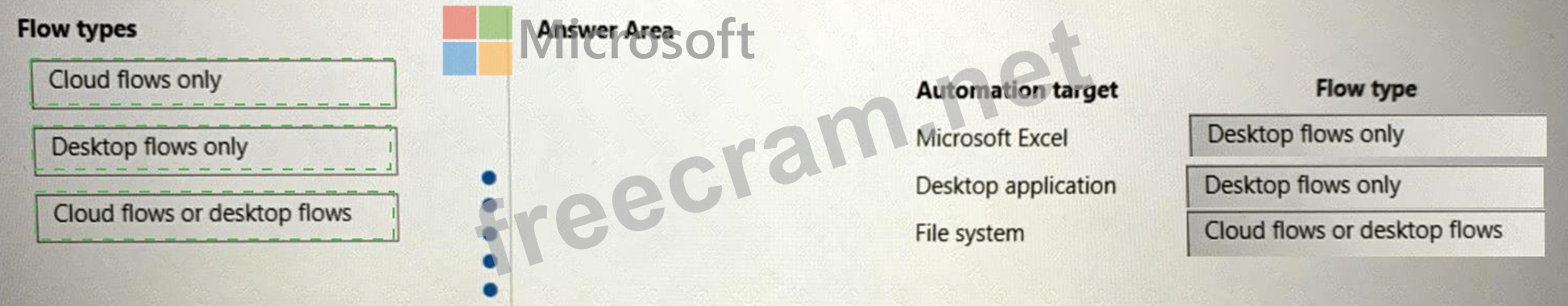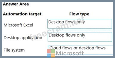 Which flow types should you use? To answer, drag the appropriate flow types to the correct automation targets. Each flow type may be used once, more than once, or not at all. You may need to drag the split bar between panes or scroll to view content.
