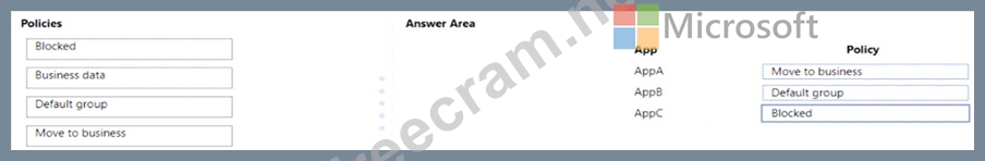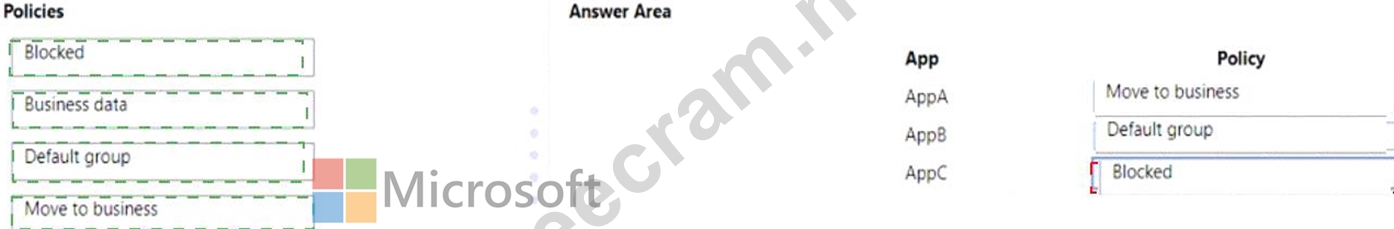 Which policy should you use for each app? To answer, drag the appropriate policies to the correct apps. Each app may be used once, more than once, or not at all. You may need to drag the split bar between panes or scroll to view content.