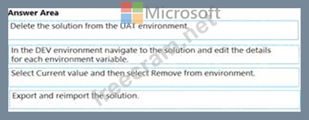 You create a Microsoft Power Platform solution. You create variables to define input values for the flow. You export the solution as managed and import the solution into a user acceptance testing (UAT) environment.