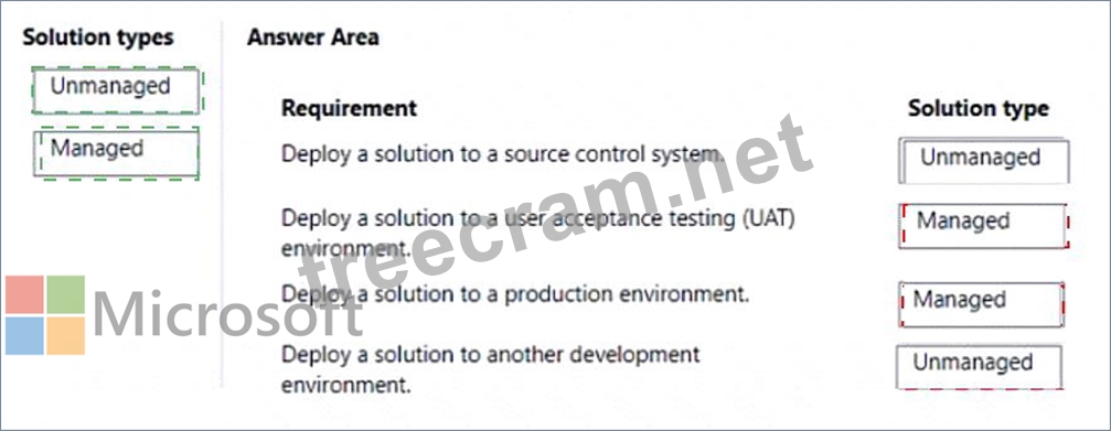 Which type of solutions should you create? To answer, drag the appropriate solution types to the correct requirements. Each solution type may be used once, more the once, or not at all. You may need to drag the split bar between panes or scroll to view content.