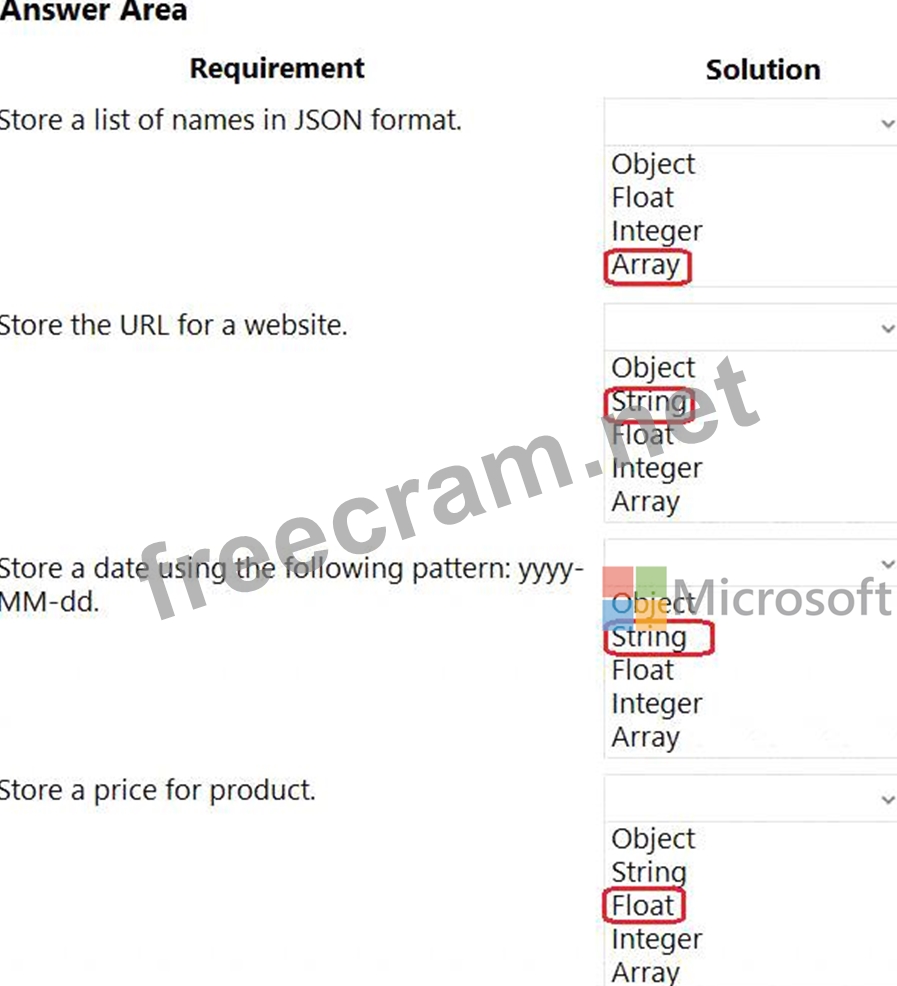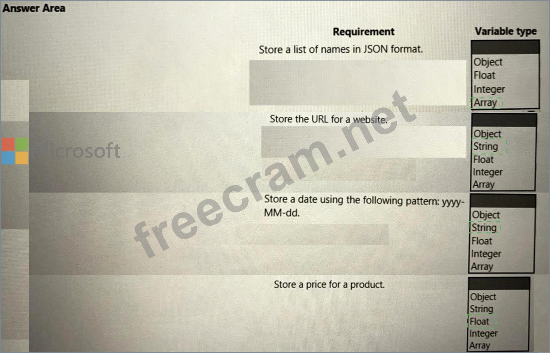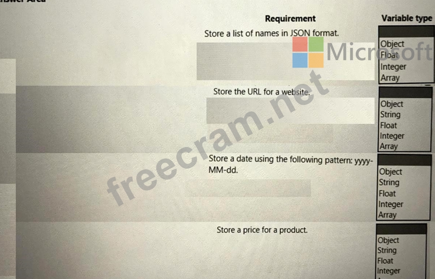 Which types of variables should you use for each type of data? To answer, select the appropriate options in the answer area.