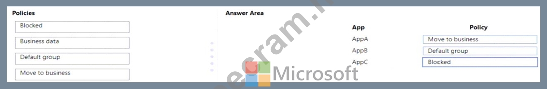 Which policy should you use for each app? To answer, drag the appropriate policies to the correct apps. Each app may be used once, more than once, or not at all. You may need to drag the split bar between panes or scroll to view content.