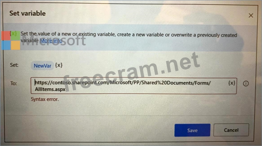 The Set variable page alerts you that there is a syntax error. You need to resolve the issue. What should you do?