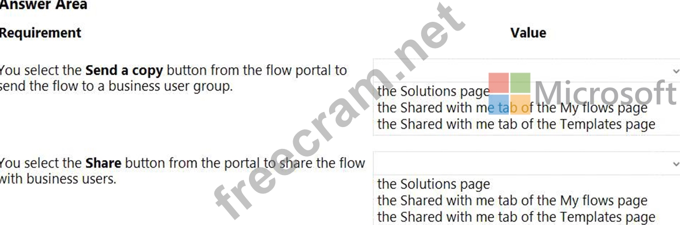 Question 9: You create the following flow: (Exhibit) Use the drop-down m...