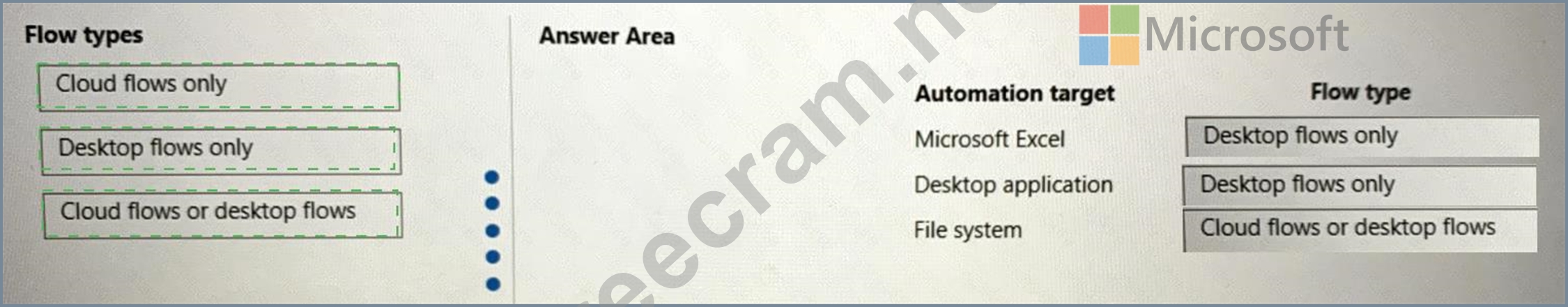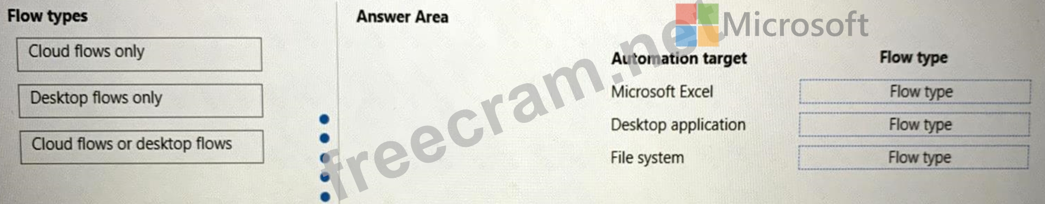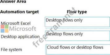Which flow types should you use? To answer, drag the appropriate flow types to the correct automation targets. Each flow type may be used once, more than once, or not at all. You may need to drag the split bar between panes or scroll to view content.