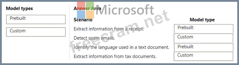Which type of model should you use for each scenario? To answer, drag the appropriate model types to the correct scenarios. Each model may be used once, more than once, or not at all. You may need to drag the split bar between panes or scroll to view content.