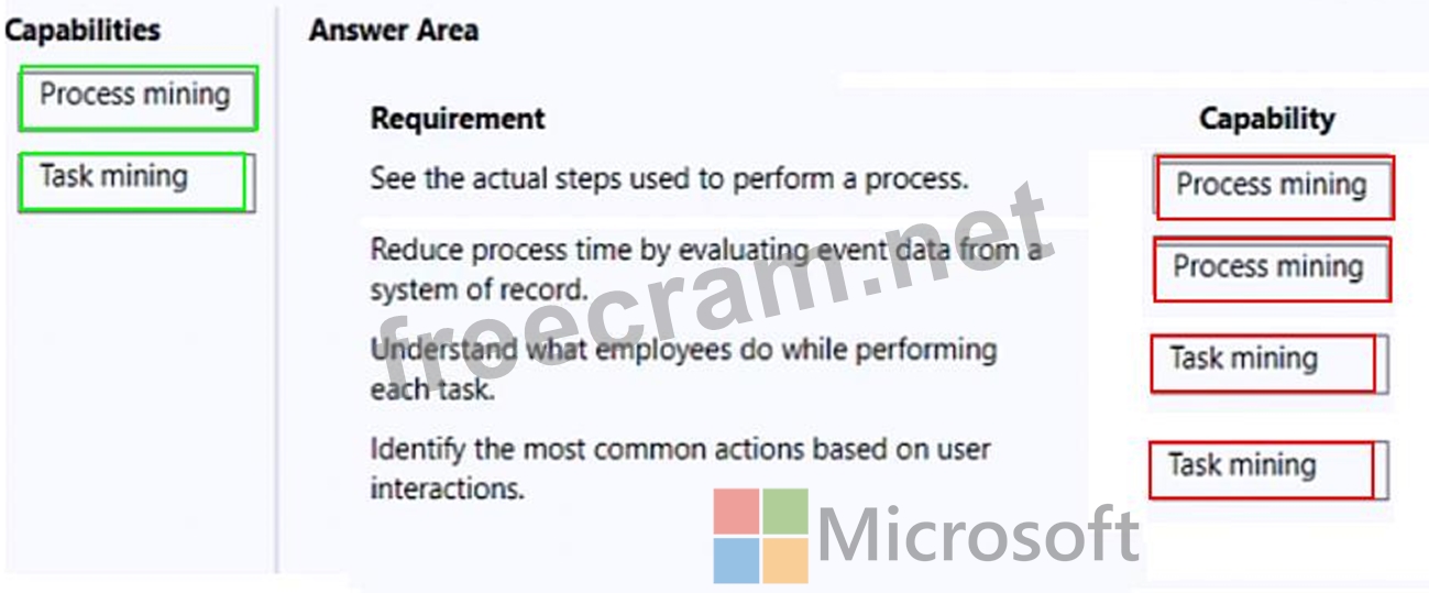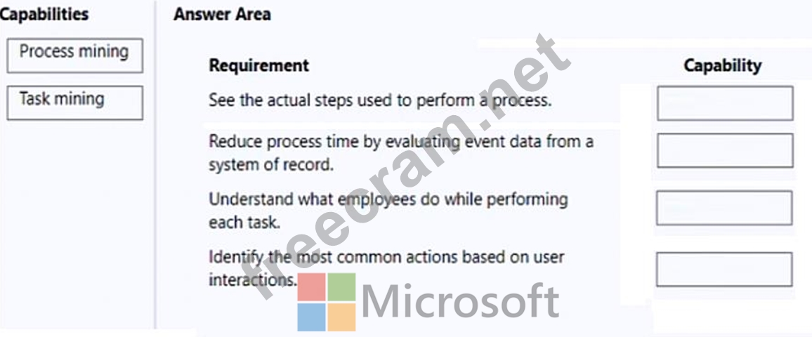 Which Process advisor capability should you use? To answer, drag the appropriate capabilities to the correct requirements. Each capability may be used once, more than once, or not at all. You may need to drag the split bar between panes or scroll to view content.
