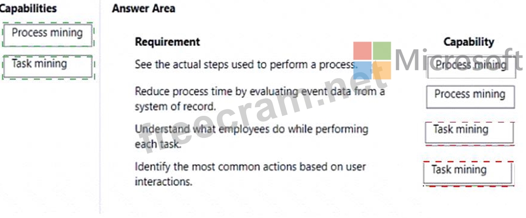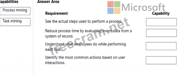 Which Process advisor capability should you use? To answer, drag the appropriate capabilities to the correct requirements. Each capability may be used once, more than once, or not at all. You may need to drag the split bar between panes or scroll to view content.