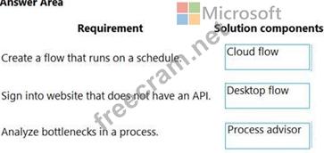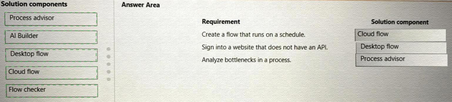 Which solution components should you use? To answer, drag the appropriate solution components to the correct requirements. Each solution component may be used once, more than once, or not at all. You may need to drag the split bar between panes or scroll to view content.