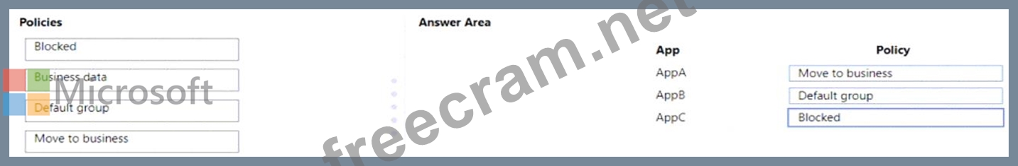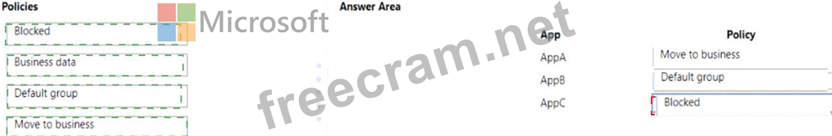 Which policy should you use for each app? To answer, drag the appropriate policies to the correct apps. Each app may be used once, more than once, or not at all. You may need to drag the split bar between panes or scroll to view content.