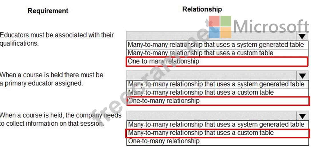 Which type of table relationship should you use? To answer, select the appropriate options in the answer area.