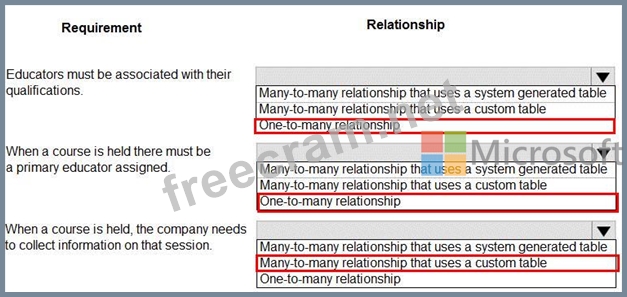 Which type of table relationship should you use? To answer, select the appropriate options in the answer area.
