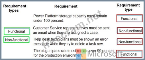 Which requirement type should you use? To answer, drag the appropriate requirement types to the correct requirements. Each requirement type may be used once, more than once, or not at all. You may need to drag the split bar between panes or scroll to view content.