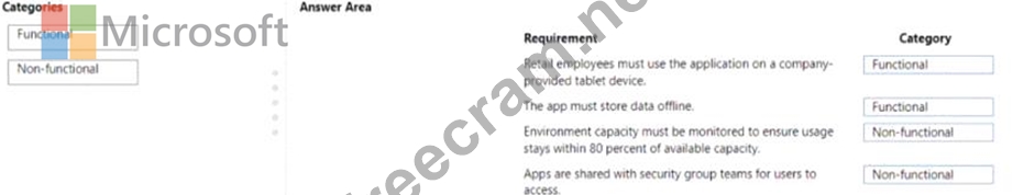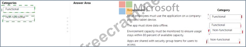 How should you categorize the requirements? To answer, drag the appropriate categories to the correct requirements. Each category may be used once, more than once, or not at all You may need to drag the split bar between panes or scroll to view content.