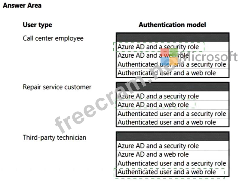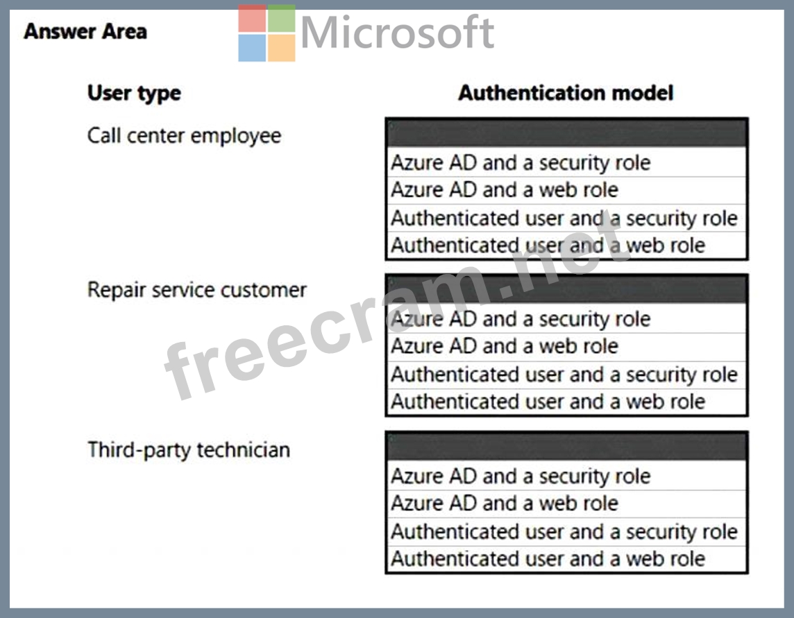 The solution dispatches a technician to troubleshoot and repair customer issues. Customers sign into a customer portal to view and log information concerning the repairs. The repair service contracts with third party technicians for repair jobs The solution must meet the following requirements: