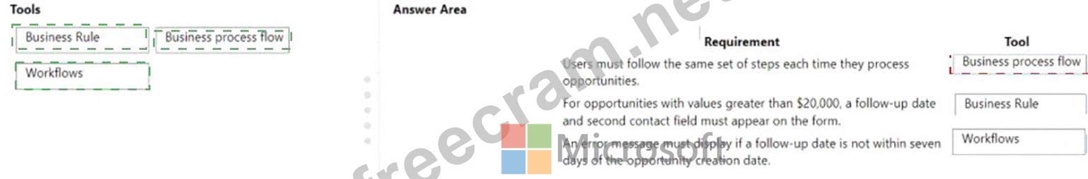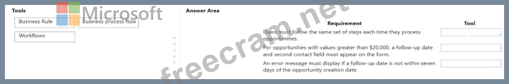 What should you recommend? To answer, drag the appropriate tools to the correct requirement. Each tool may be used once, more than once, or not at all. You may need to drag the split bar between panes or scroll to view content.