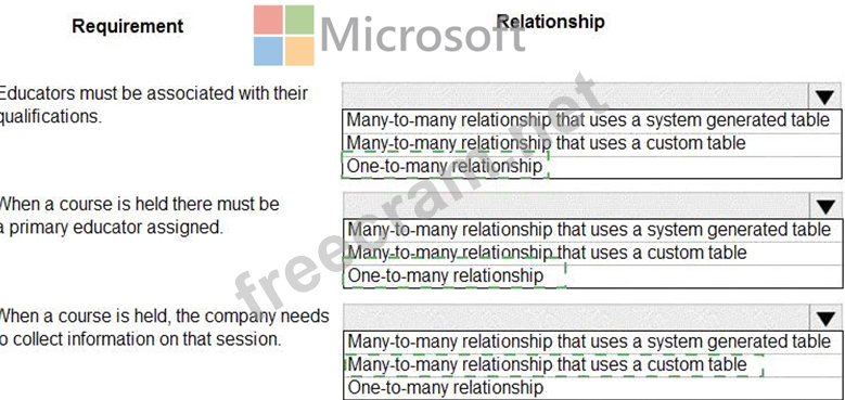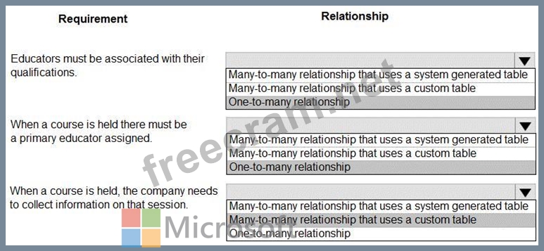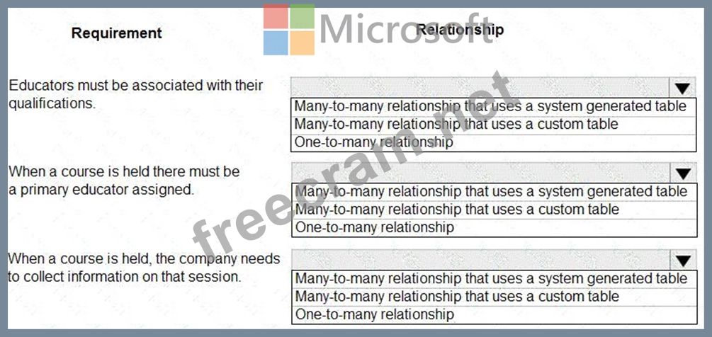 Which type of table relationship should you use? To answer, select the appropriate options in the answer area.