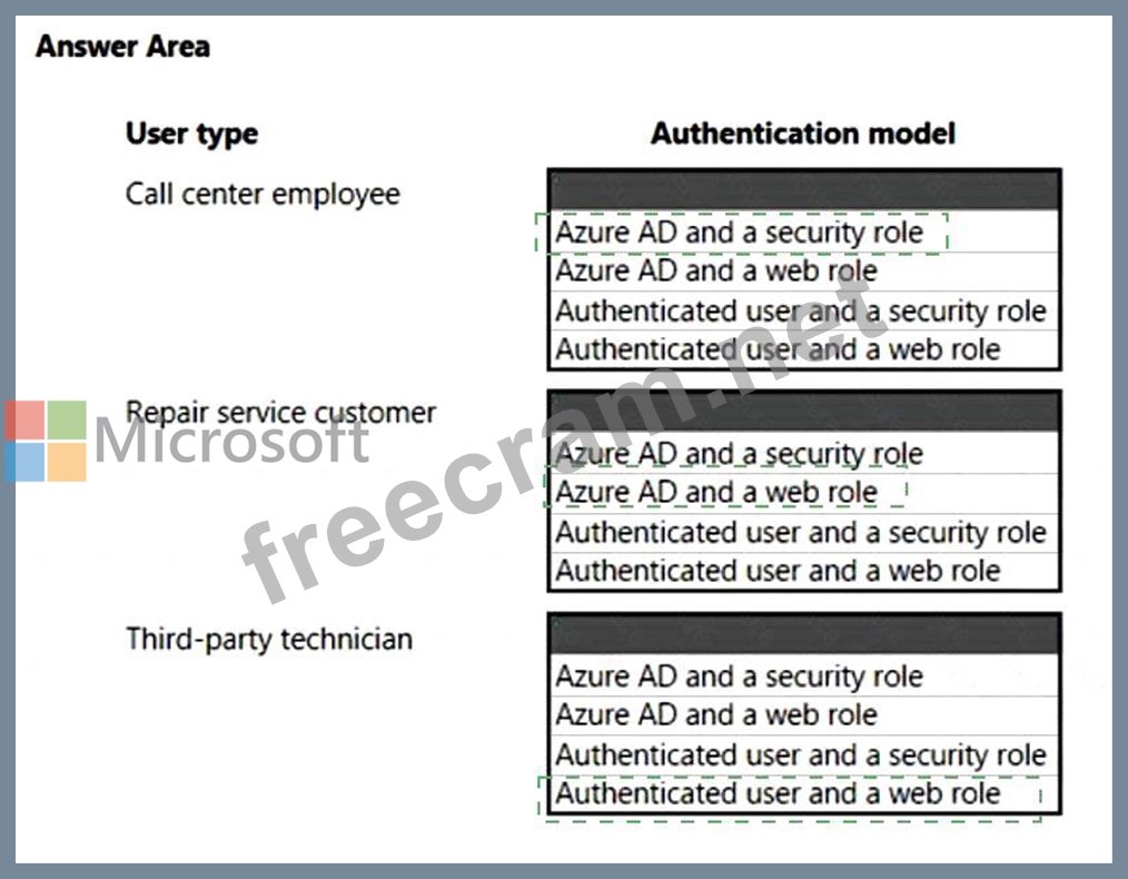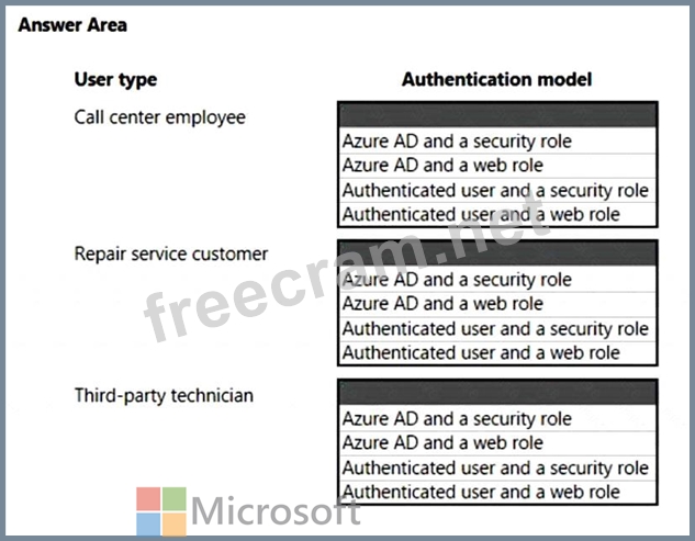 The solution dispatches a technician to troubleshoot and repair customer issues. Customers sign into a customer portal to view and log information concerning the repairs. The repair service contracts with third party technicians for repair jobs The solution must meet the following requirements: