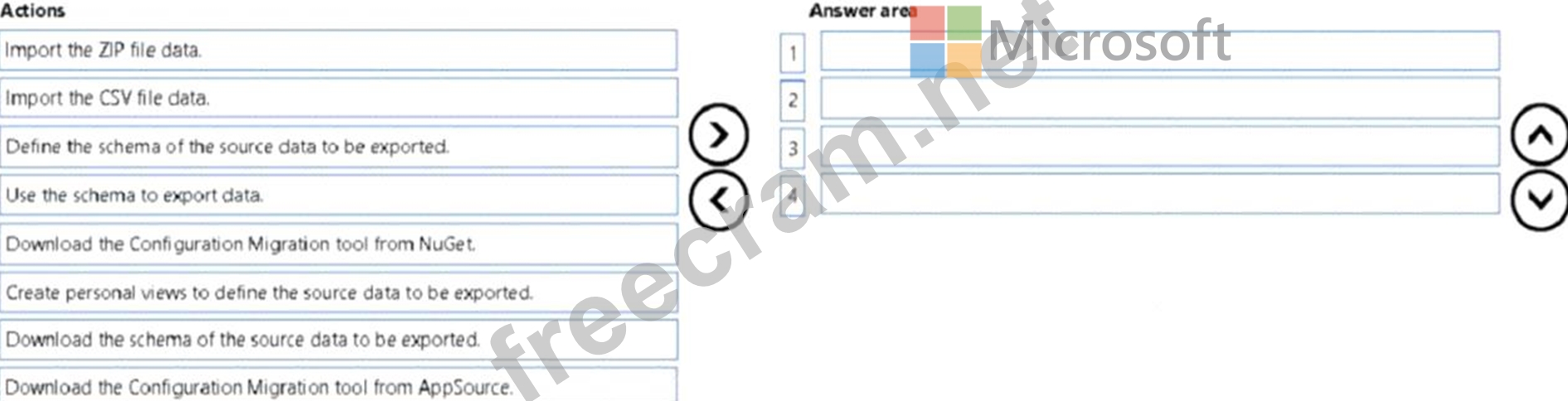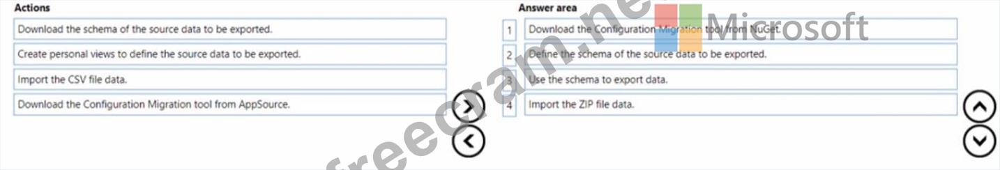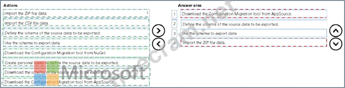 You need to design a process to transport configuration and test data from one environment to a separate environment Which four actions should you recommend be performed in sequence? To answer, move the appropriate actions from the list of actions to the answer area and arrange them in the correct order.