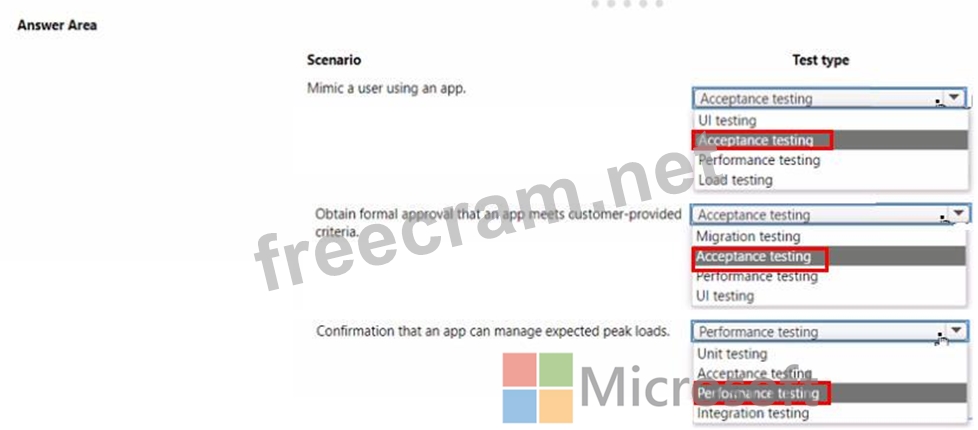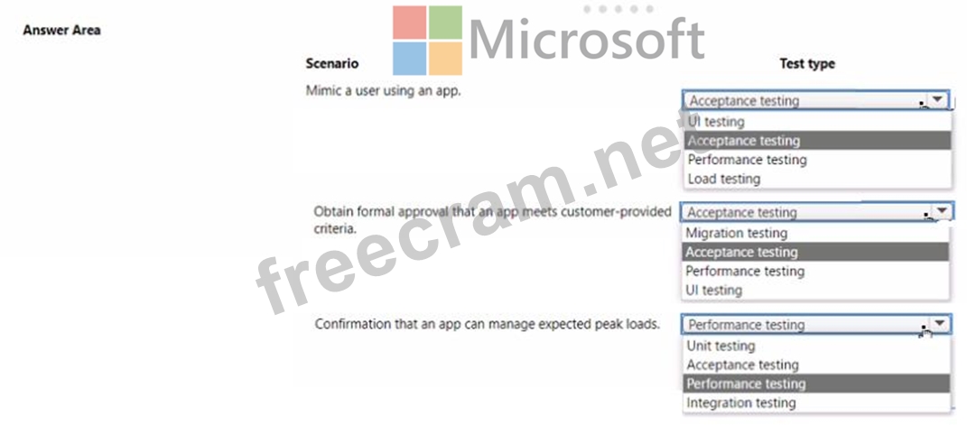Which test types should you use? To answer, select the appropriate options in the answer area.