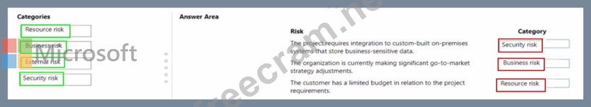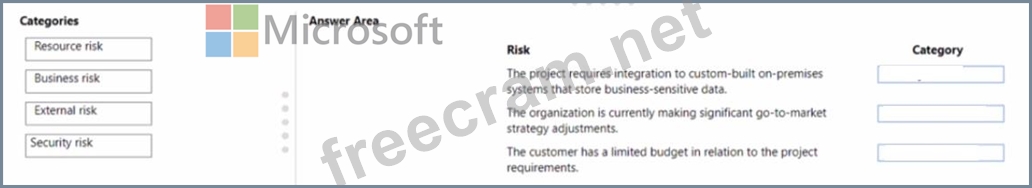 How should you categorize the risks? To answer, drag the appropriate categories to the correct risks. Each category may be used once, more than once, or not at all. You may need to drag the split bar between panes or scroll to view content.