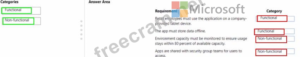 How should you categorize the requirements? To answer, drag the appropriate categories to the correct requirements. Each category may be used once, more than once, or not at all You may need to drag the split bar between panes or scroll to view content.