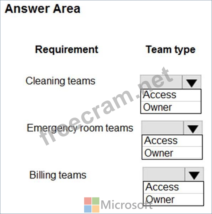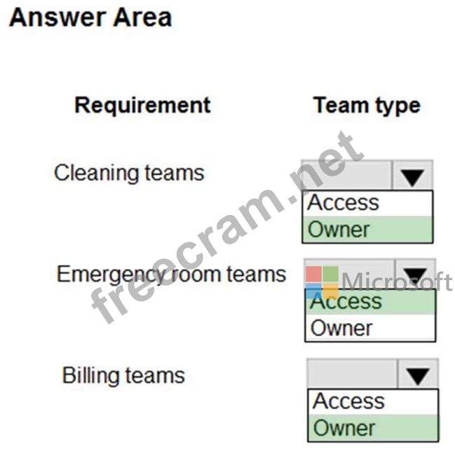 Access team: An access team doesn't own records and doesn't have security roles assigned to the team. The team members have privileges defined by their individual security roles and by roles from the teams they're members of. These members share records with an access team, and the team is granted access rights to the records. Access rights include Read, Write, and Append.