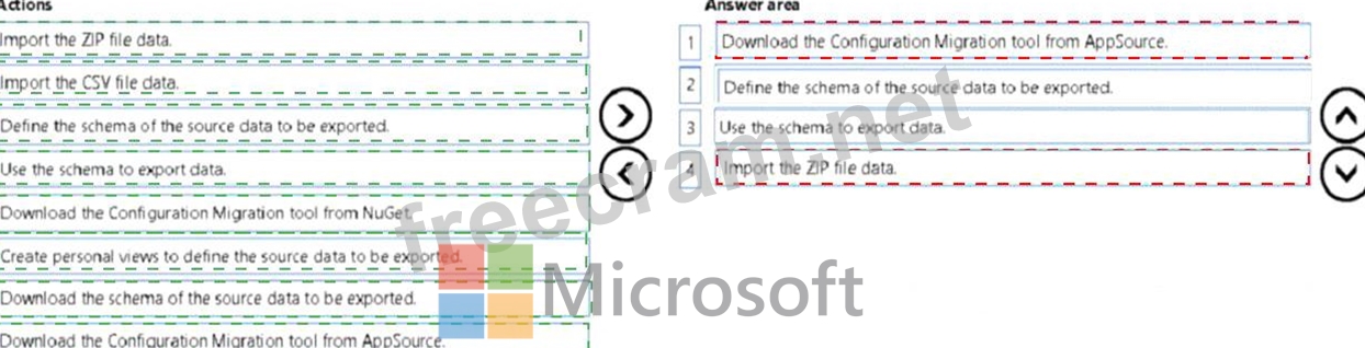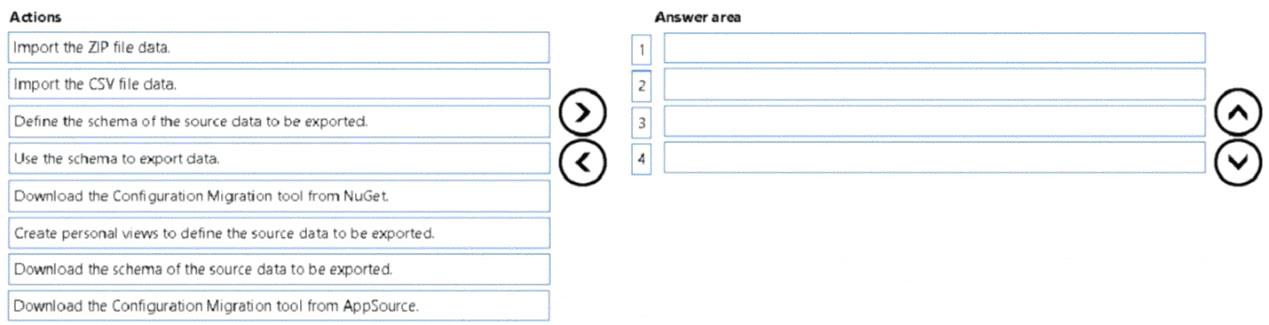 You need to design a process to transport configuration and test data from one environment to a separate environment Which four actions should you recommend be performed in sequence? To answer, move the appropriate actions from the list of actions to the answer area and arrange them in the correct order.