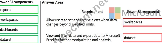 Which Power BI components should the company use? To answer, drag the appropriate Power BI components to the correct requirements. Each Power BI component may be used once, more than once, or not at all. You may need to drag the split bar between panes or scroll to view content.