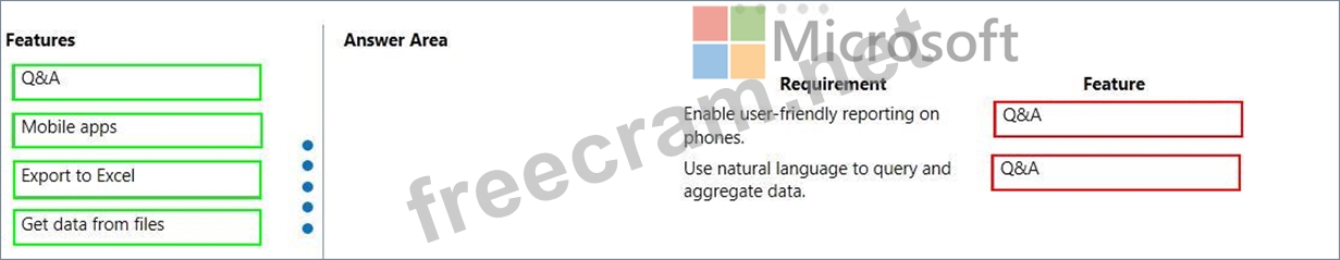Match each Power Bl feature to its requirement. To answer, drag the appropriate features from the column on the left to its requirement on the right. Each option may be used once, more than once, or not at all.
