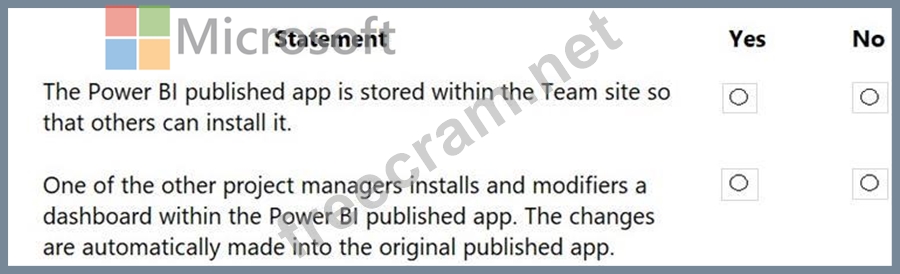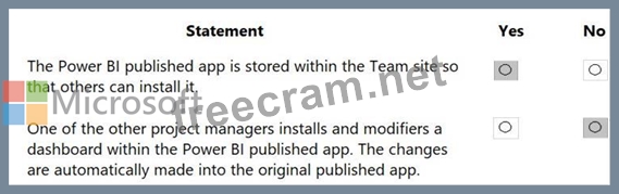 You create reports within Power BI to report on the status of a project. A manager asks you to share the reports with other team members. You decide to create a published app and set permissions to allow other team members to view the reports.