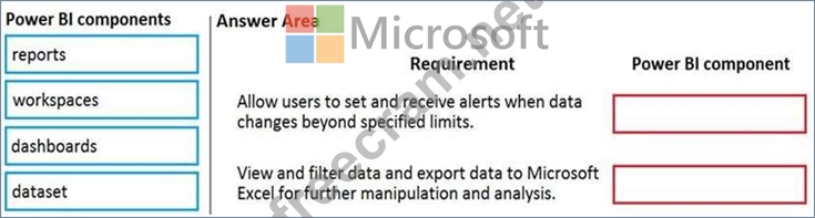 Which Power BI components should the company use? To answer, drag the appropriate Power BI components to the correct requirements. Each Power BI component may be used once, more than once, or not at all. You may need to drag the split bar between panes or scroll to view content.
