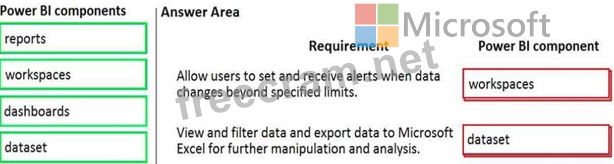 Which Power BI components should the company use? To answer, drag the appropriate Power BI components to the correct requirements. Each Power BI component may be used once, more than once, or not at all. You may need to drag the split bar between panes or scroll to view content.