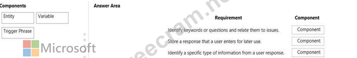 Which components should you use? To answer, drag the appropriate components to the correct requirements. Each component may be used once, more than once, or not at all. You may need to drag the split bar between panes or scroll to view content.